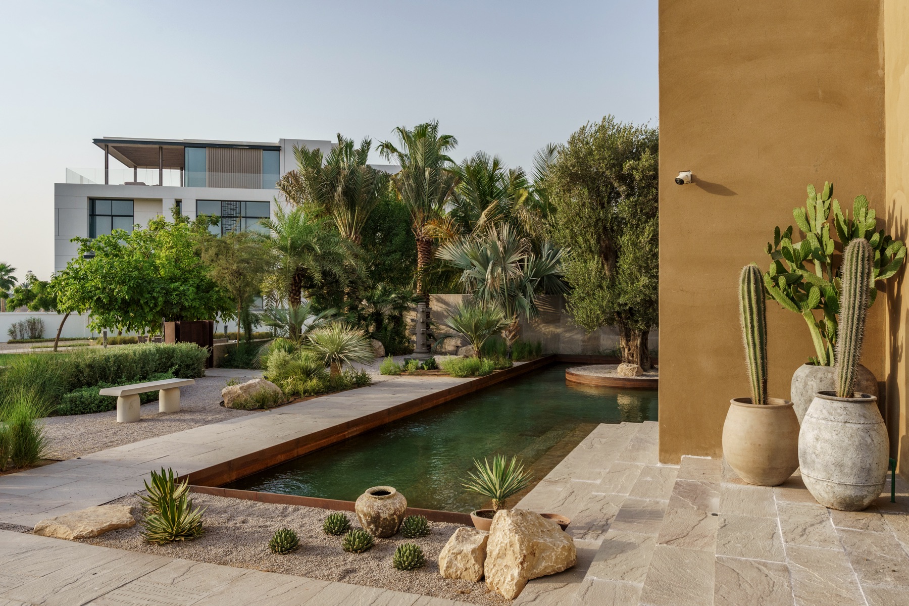 Introducing the Orange Box project, a remarkable Vastu-compliant home nestled in the upscale Dubai Hills neighborhood. In collaboration with VDGA Architects, Urban Landscapes has crafted a residential outdoor space that seamlessly blurs the boundaries between indoor and outdoor living, fully embracing its desert surroundings.